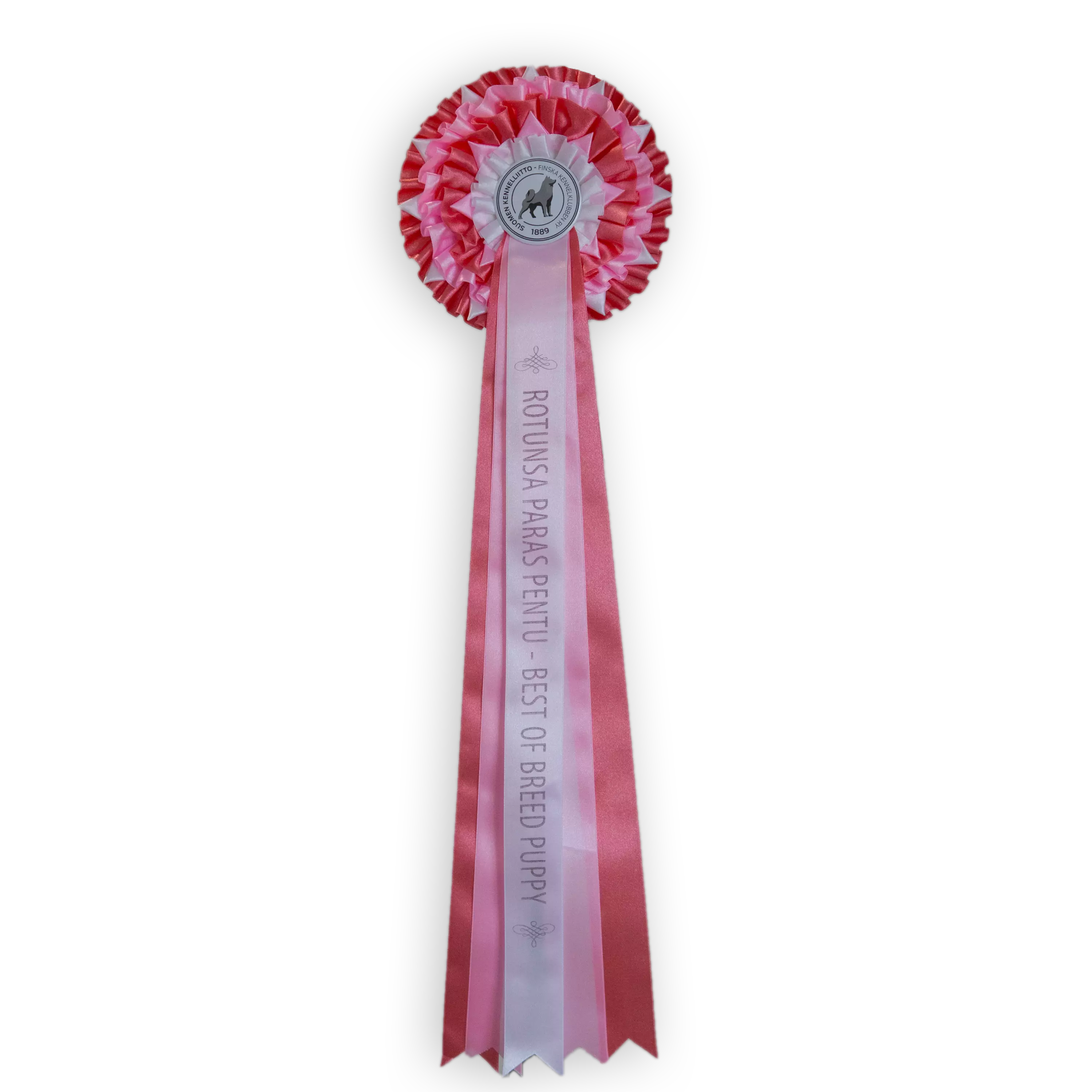 ROP PEN ruusuke on saanut uuden ihastuttavan mallin! Rotunsa paras pentu ruusuke on halkaisijaltaan noin 18,5 cm ja siinä on 5 nauhaa, joiden pituus on noin 56 cm. Ruusukkeen takana on koukkukiinnitys. Metallisessa keskiössä on Kennelliiton logopainatus.