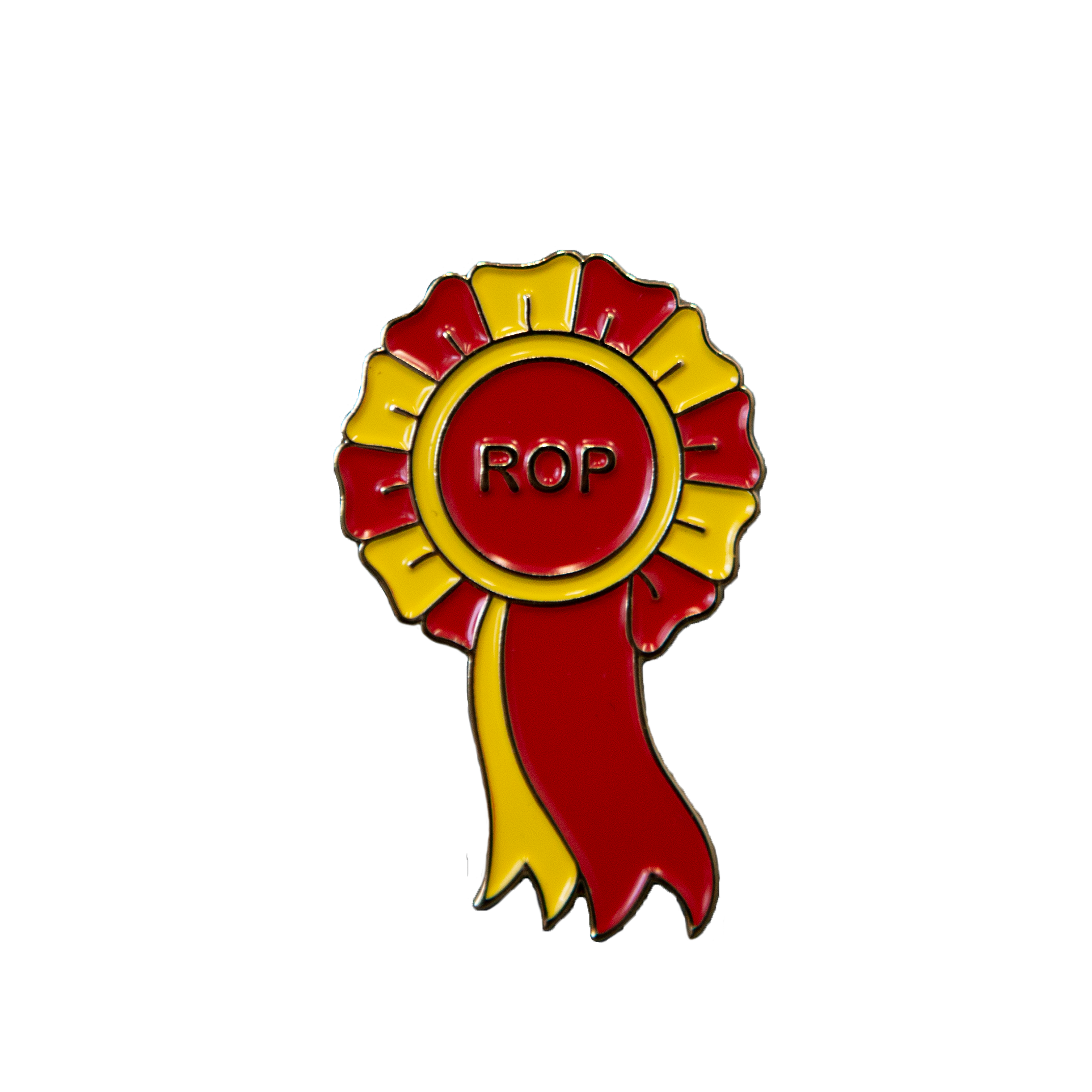 Ruusukkeen muotoinen ROP pinssi. Pinssi on n.4cm pitkä ja n. 3 cm leveä.