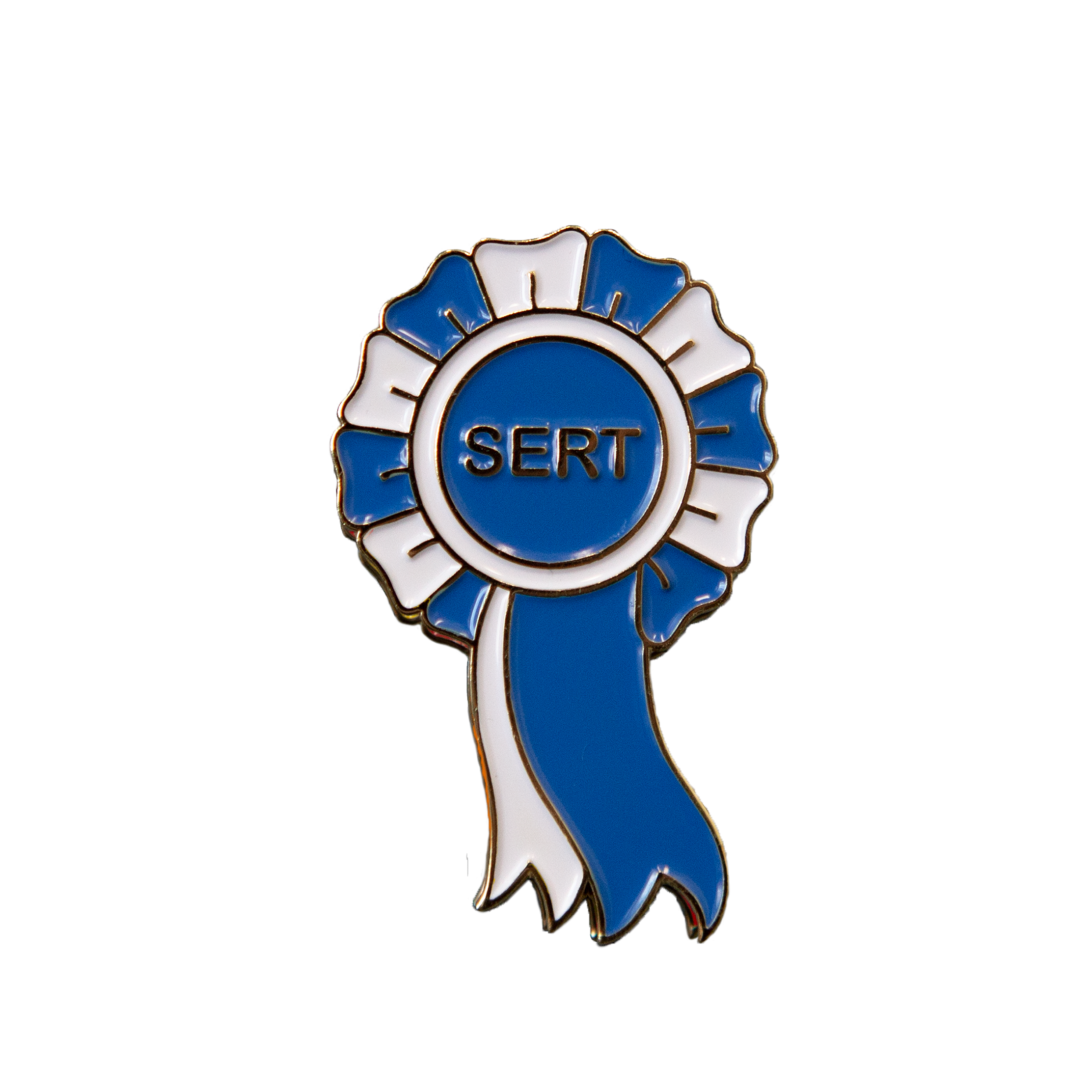 Ruusukkeen muotoinen SERT pinssi. Pinssi on n.4cm pitkä ja n. 3 cm leveä.