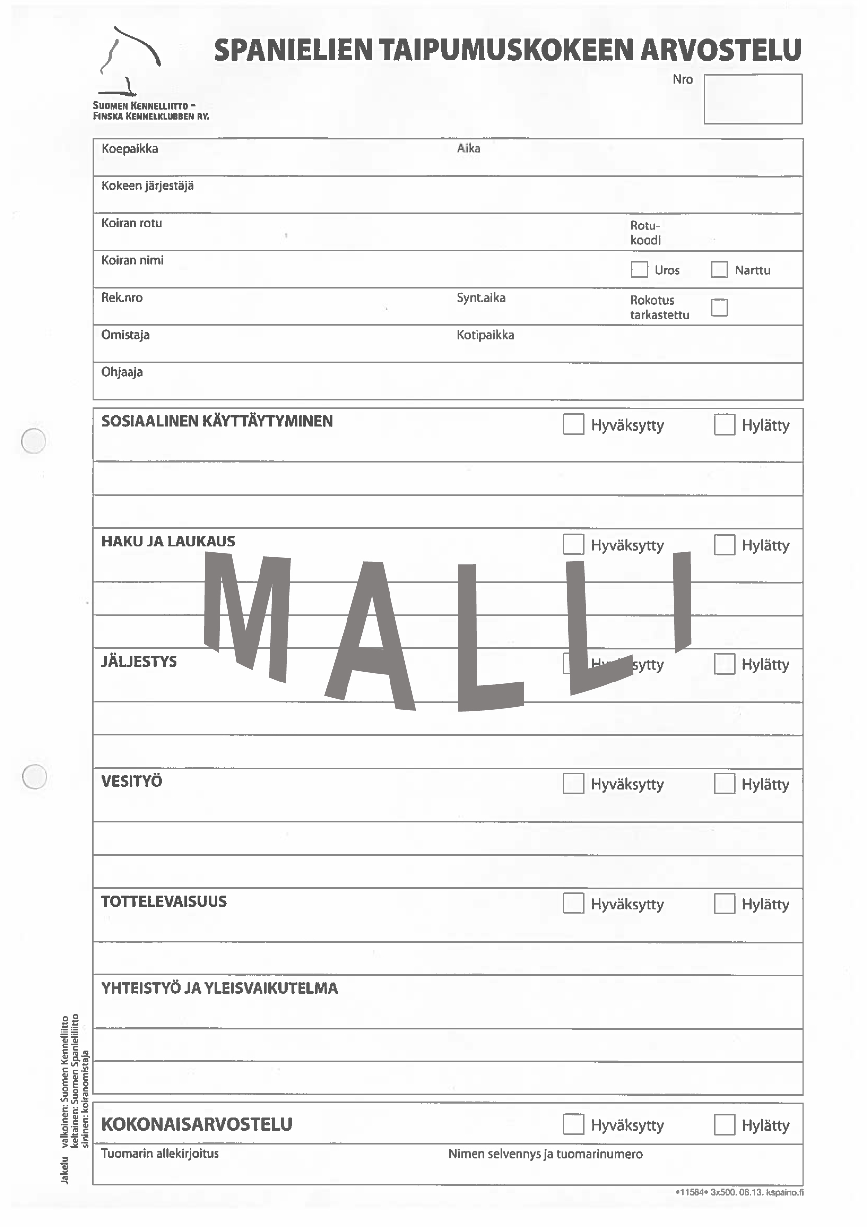 SPA. Spanieleiden taipumuskokeen arvostelu. (pöytäkirja)