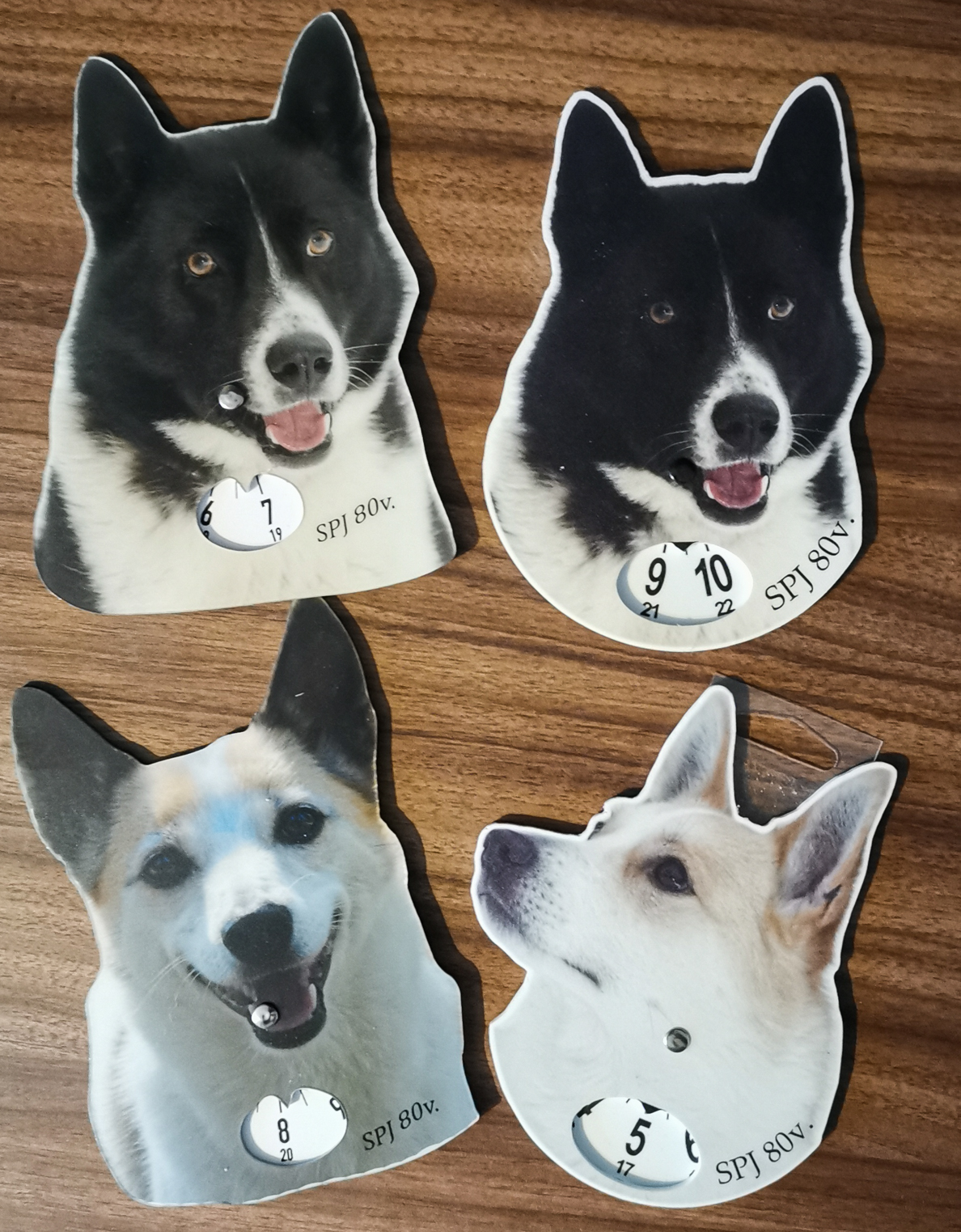 Pystykorvajärjestön parkkikiekkoja on 3 erilaista: Ensimmäisessä kuvassa ylhäältä vasemmalla KK Kamu 1 ja oikealla KK Kamu 2-> TÄMÄ LOPPU!. Alarivillä vasemmalla PPK Minta ja oikealla PPK Jekku-> TÄMÄ LOPPU!. Toisessa kuvassa SPK, joita on vain yhdelaista. Kirjoita haluamasi malli tilauksen Lisätietoja-kenttään. Pidätämme oikeuden vaihtaa rodunsisäisesti toiseen malliin, mikäli toivomasi malli on päässyt loppumaan.