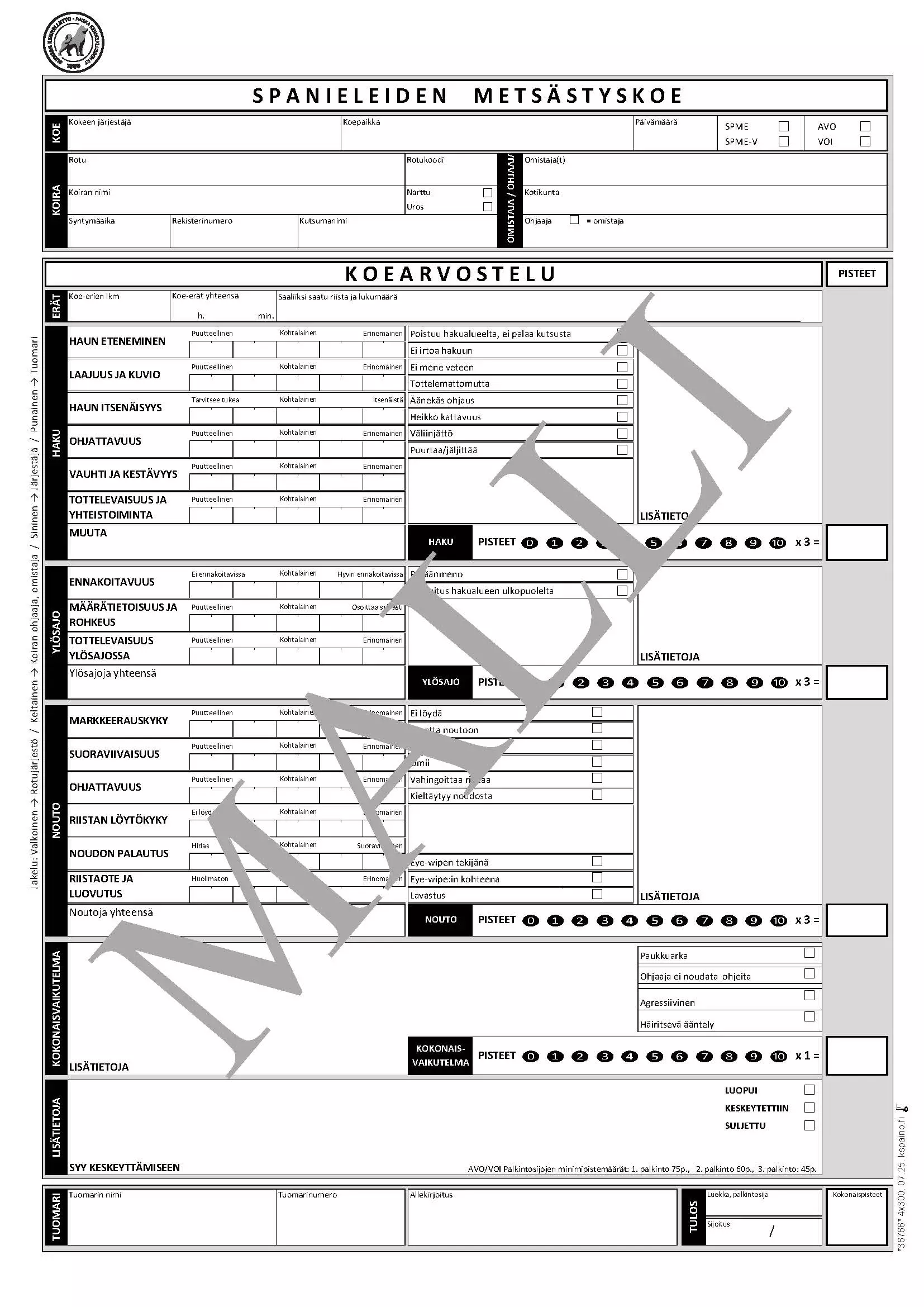 Spanieleiden metsästyskokeen (SPME) pöytäkirja.Vuoden 2025 painos.