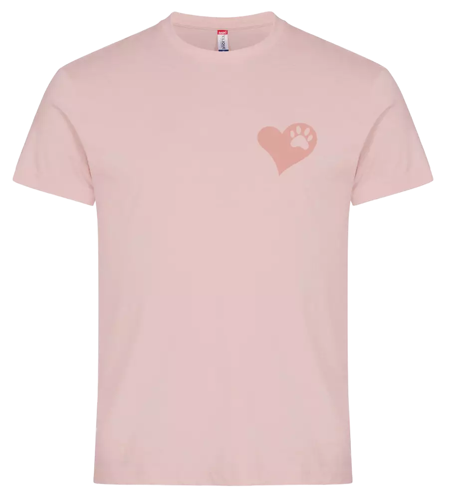Ihastuttava vaaleanpunainen unisex t-paita tassukuvioilla. T-paidan vasemmassa rinnassa on ihana sydäntassukuvio ja selkäpuolta koristaa tassujono.