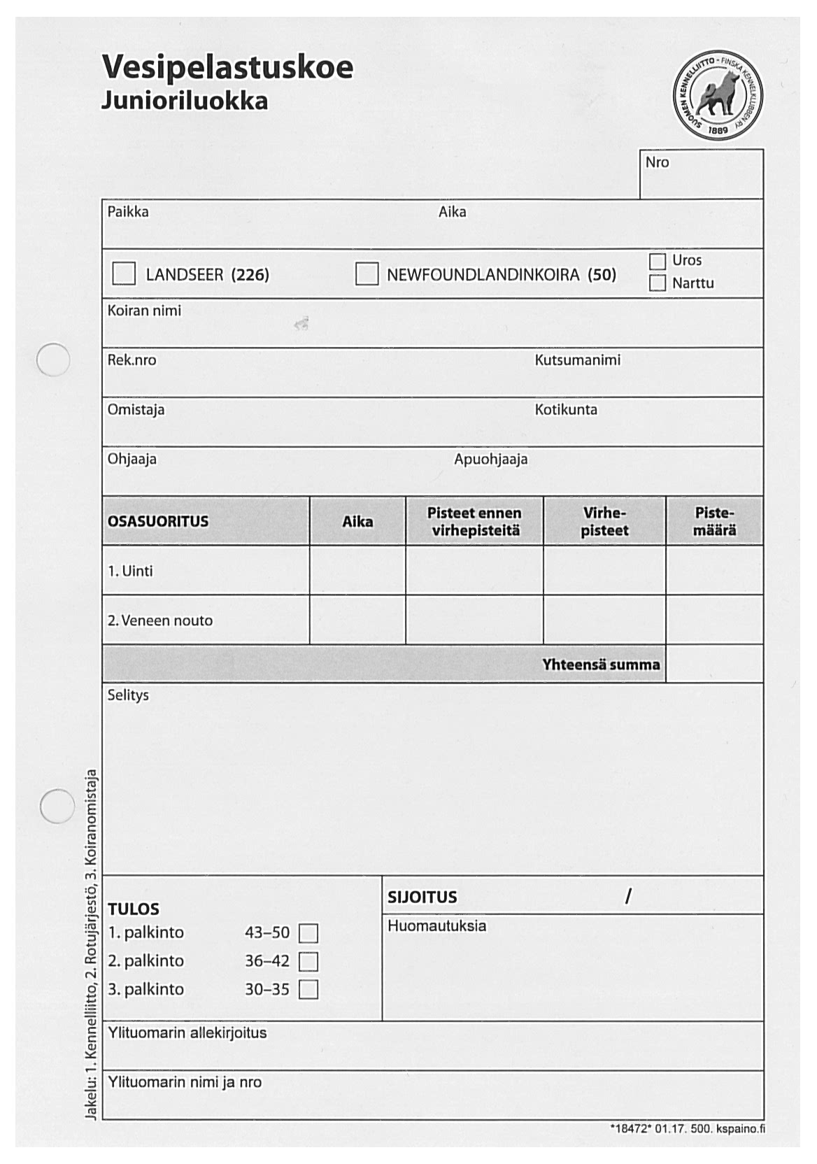 Vesipelastuskokeen (VEPE) pöytäkirja junioriluokka