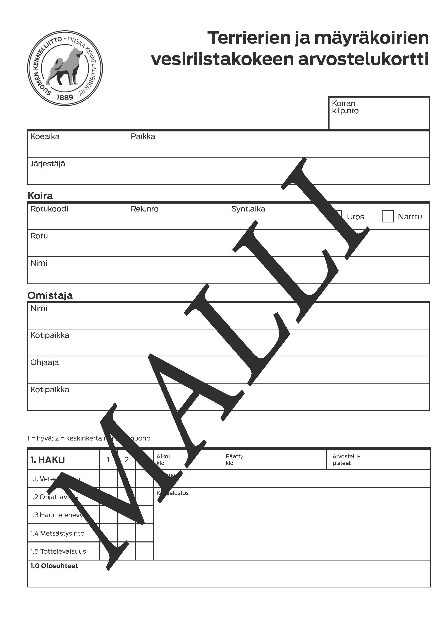 VERI arvostelukortti. Terrierien ja mäyräkoirien vesiriistakokeen arvostelukortti.