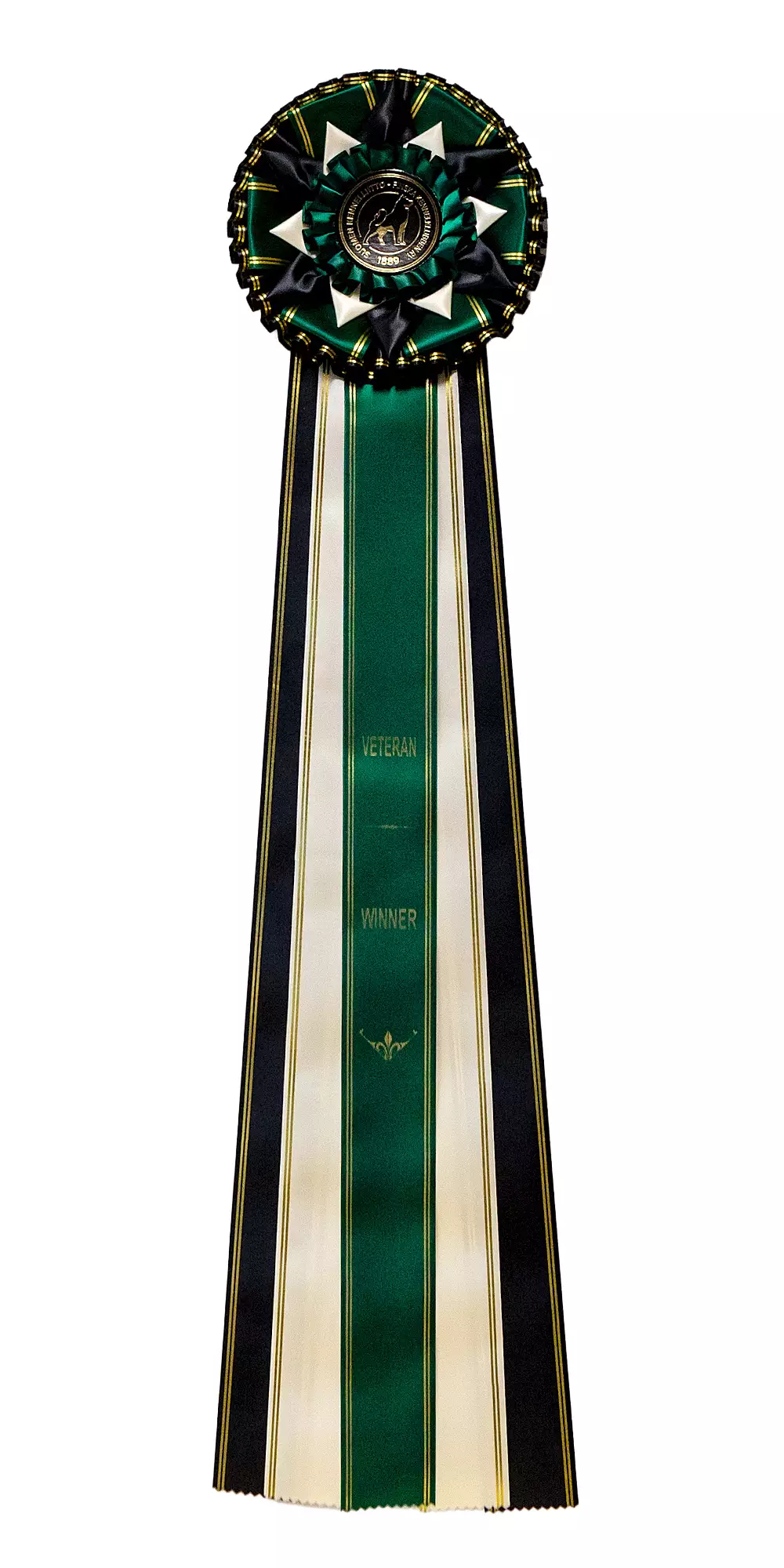 Upea Veteraani Voittaja ruusuke. Halkaisija 16 cm, viisi nauhaa joiden pituus 57 cm. Ruusukkeen materiaali napakka, kiiltävä silkki. Takana koukkukiinnitys. Keskiössä Kennelliiton logo.