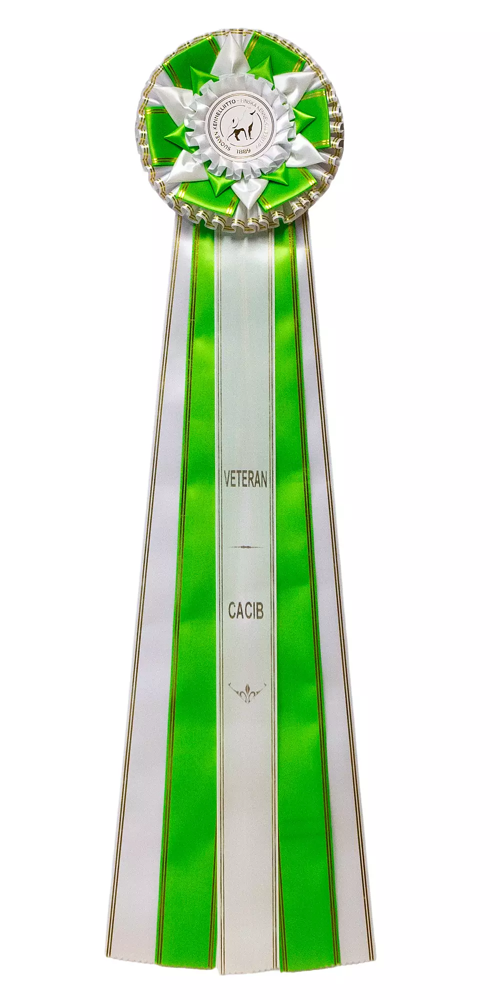 Upea iso VETERAN CACIB ruusuke. Ruusukkeen materiaali on napakka, kiiltävä silkki. Takana koukkukiinnitys. Keskiössä Knnelliiton logo. Ruusukkeen halkaisija on noin 16 cm ja siinä on viisi nauhaa, joiden pituus on noin 57 cm.