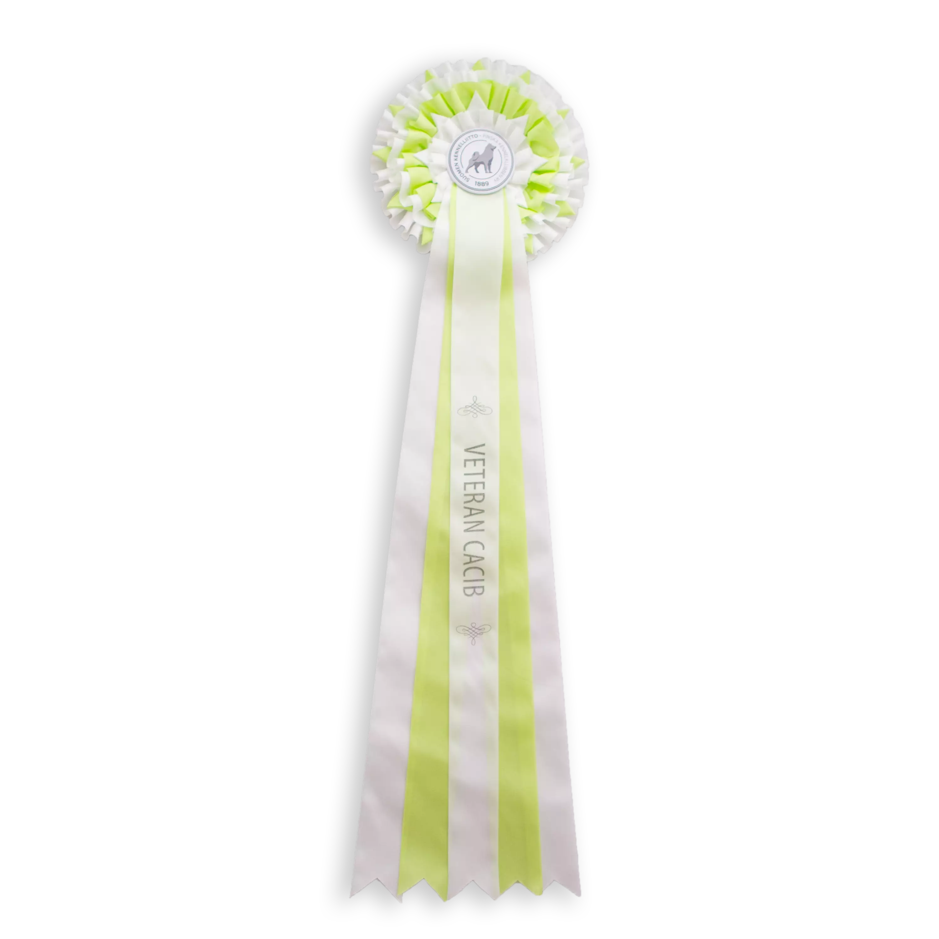VETERAN CACIB ruusuke on saanut uuden ihastuttavan mallin! Veteran cacib ruusuke on halkaisijaltaan noin 18,5 cm ja siinä on 5 nauhaa, joiden pituus on noin 56 cm. Ruusukkeen takana on koukkukiinnitys. Metallisessa keskiössä on Kennelliiton logopainatus.