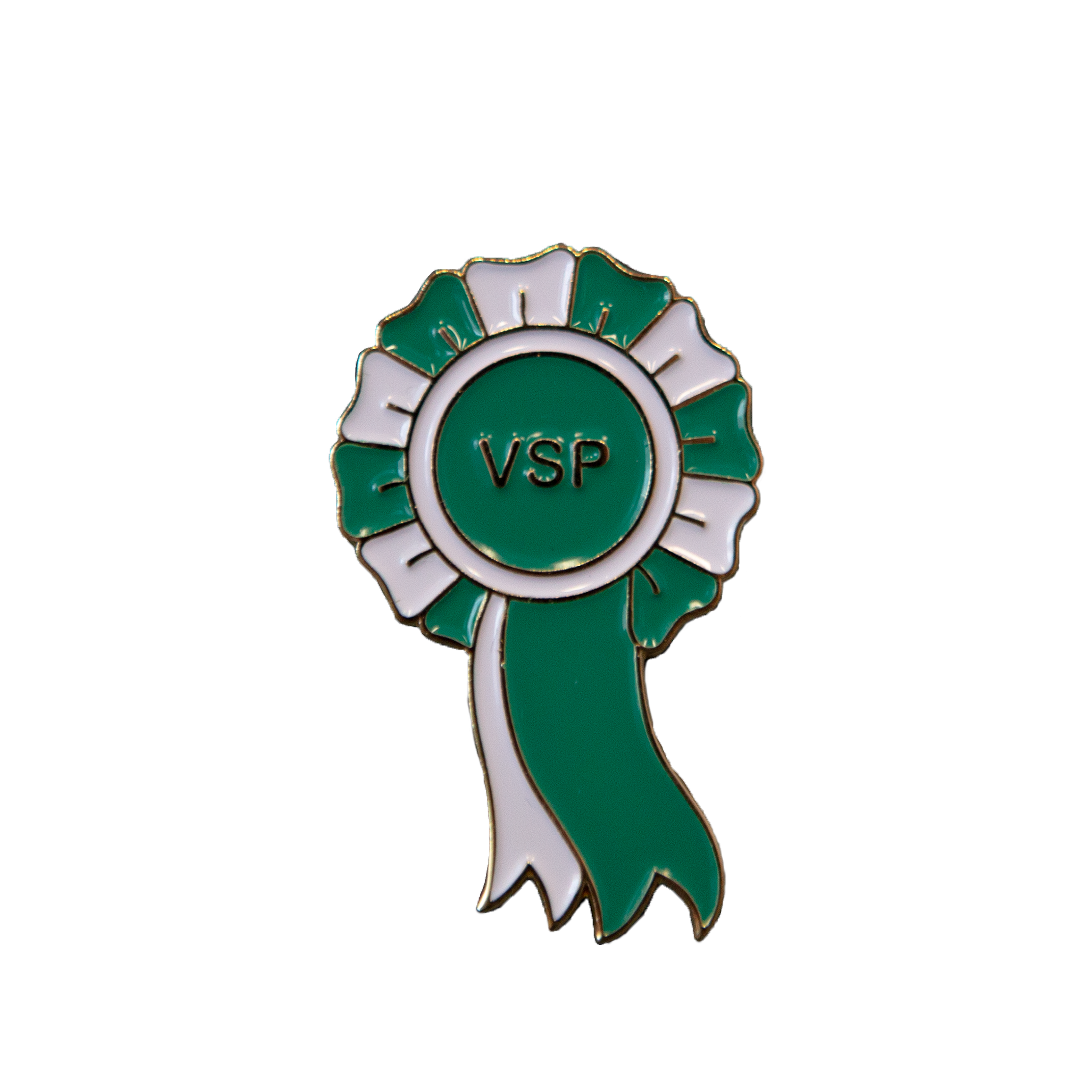 Ruusukkeen muotoinen VSP pinssi. Pinssi on n.4cm pitkä ja n. 3 cm leveä.
