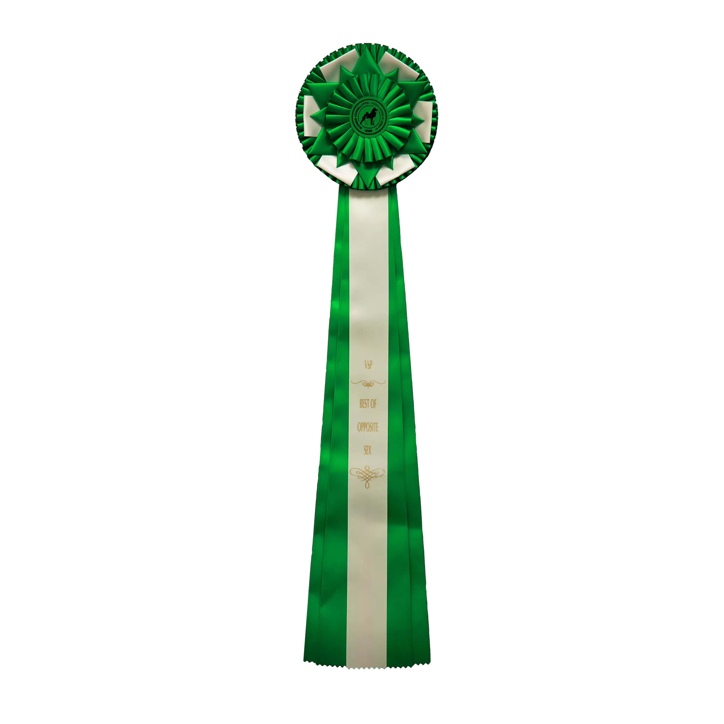 Iso VASTAKKAISEN SUKUPUOLEN PARAS -ruusuke. VSP-ruusuke on halkaisijaltaan 17,5 cm ja siinä on viisi nauhaa, joiden pituus on noin 60 cm. Nauhoissa oleva teksti on kullanvärinen. Ruusukkeen materiaali on kiiltävä silkki. Takana koukkukiinnitys. Keskiössä Kennelliiton logopainatus.
